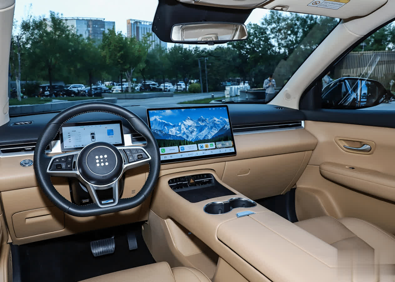 虽然走的是亲民路线,但这款车内饰看起来并不廉价,特别是中控台面的质感已经和一些20万级别的车型差不多,都是主打现在流行的悬浮中控车机屏幕,取消掉了大部分的传统机械按钮。中高配版本都是15.6英寸的大屏,而且有华为的车载系统加持。